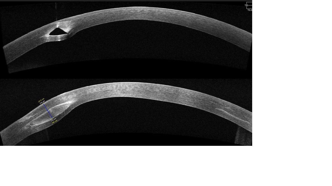 Image en coupe d'une cornée avec un anneau intracornéen (en PMMA) en haut et image d'une cornée avec un CAIRS (greffe d'un anneau en tissus humain) en bas : dans les 2 techniques, on met en place un anneau (en PMMA ou en tissus humain) dans l'épaisseur de la cornée